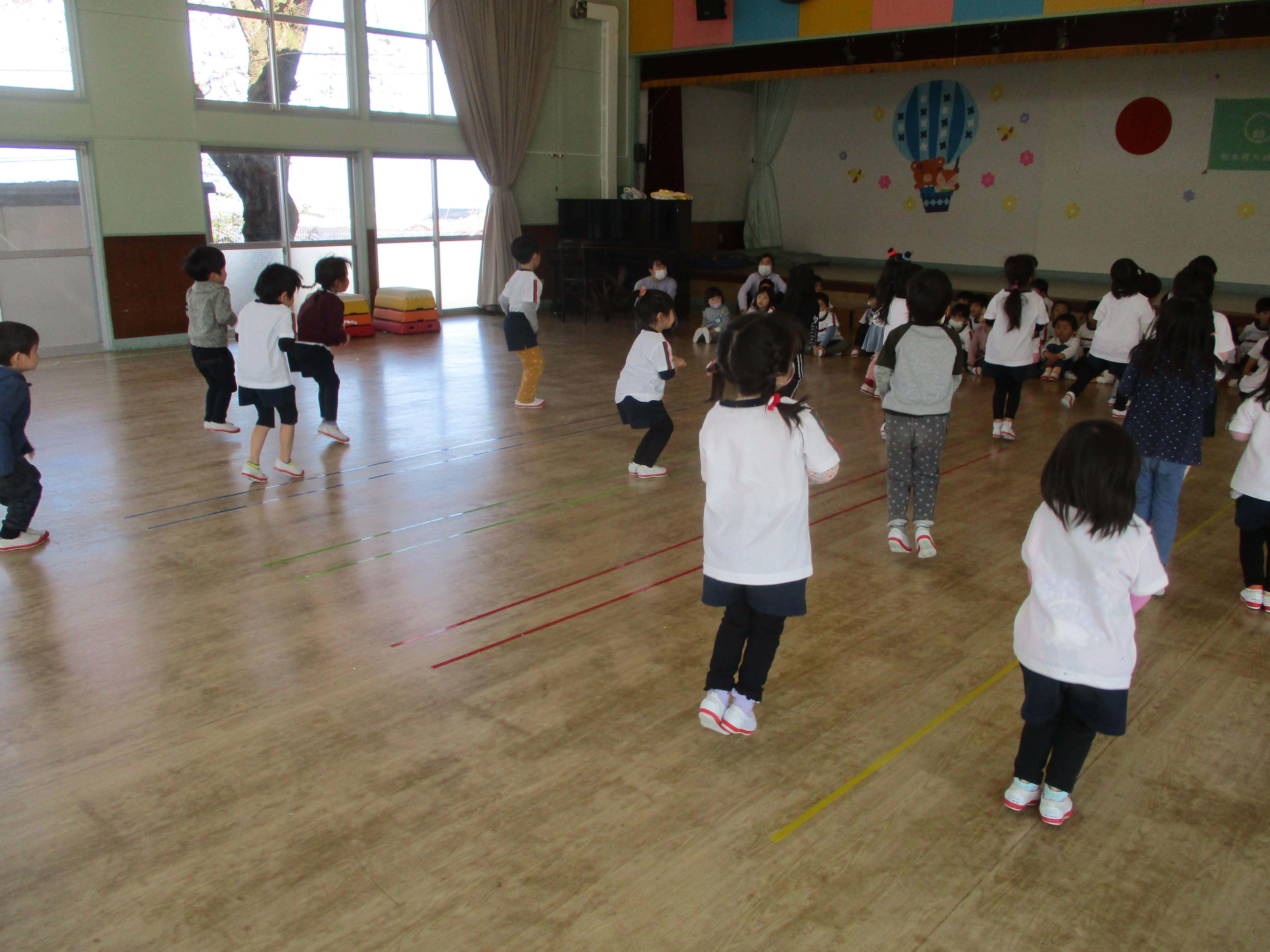 園の様子 2021.04.15 運動あそびがありました! 今日は、今年度初めての運動遊びがありました。年中さん・年長さんのグループ、年少さん・年長さんのグループの異年齢で行いました。くまさん歩きやカンガルージャンプ、ワニさん、カエルなど各学年の成長に合わせて、動物になりきりながら楽しく体を動かしました。年少さんも初めての運動遊びでしたが、年中さんの動きを真似ながら楽しみながらやってみようとする姿が見られました。この一年間でできるようになる事が増えていく事が楽しみですね♪