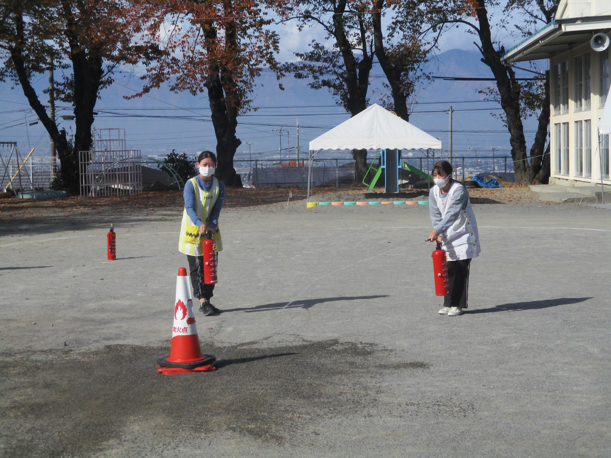 今回は芳川消防署の方にお越しいただき、訓練の様子を見てお話をして頂いたり、消火訓練も行われ、職員の中から代表で数名、消火器を使っての訓練となりました。