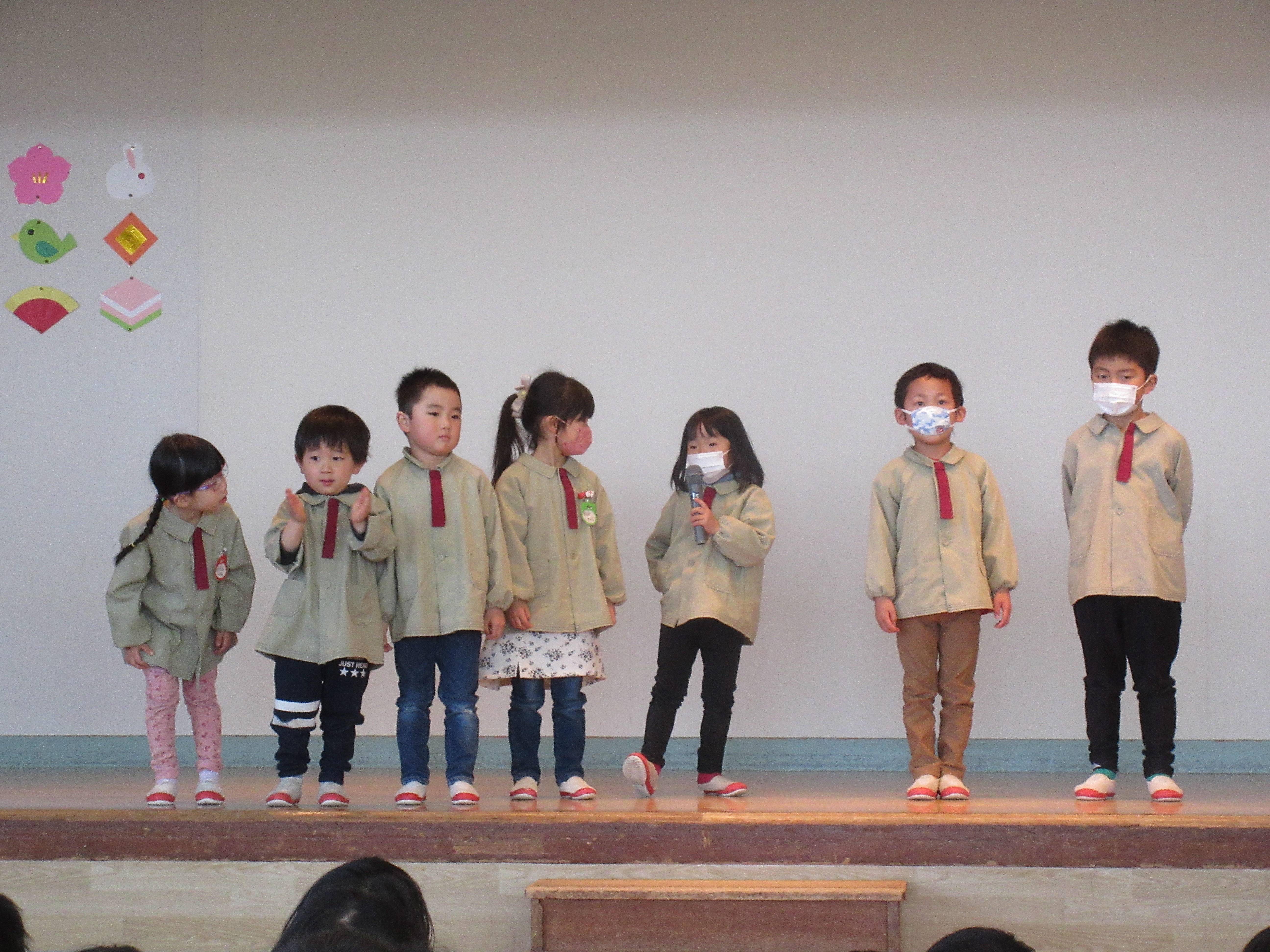 行事 2022.03.15 離任式・終業式がありました 本日、離任式・終業式が行われました。たくさん美味しい給食を作ってくれた上條先生に、みんなで感謝の気持ちを伝えることができました。終業式では、園長先生のお話、お休み中のお約束を聞き、その後各クラス一人ずつ、三学期に頑張った事・楽しかった事を発表しました。それぞれしっかりと発表することができました。年長さんは最後の終業式となりました。いよいよ明日は卒園式です!
