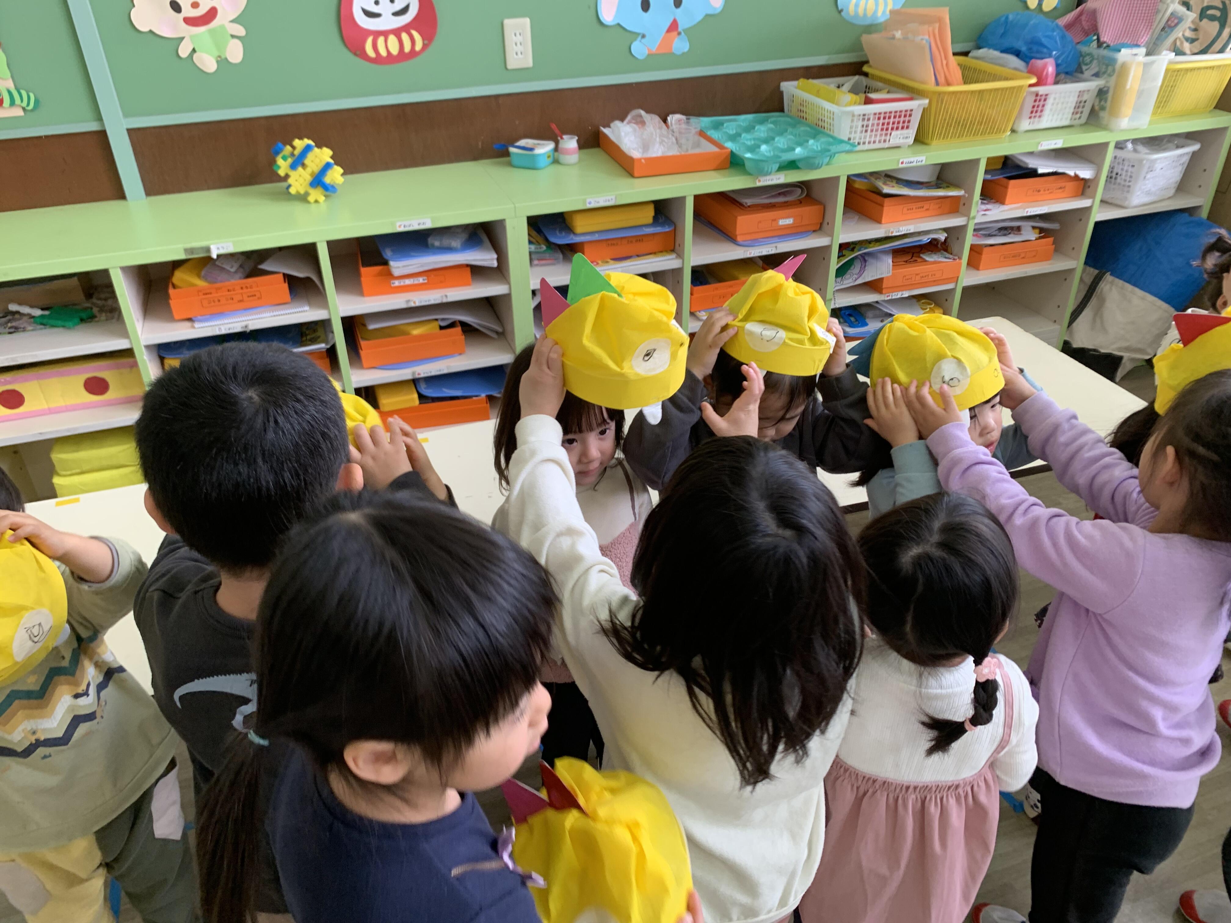 園の様子 2024.02.19 年少組と交流 今日は、ちゅうりっぷ組(二歳)とひまわり組(年少組)と交流をしました。年少さんのお部屋に行き、紙芝居や季節の歌を一緒に歌ったり年少さんが運動会の時に被ったやんちゃ怪獣の帽子を特別に貸してもらい一緒に体操をしたりと年少さんのお兄ちゃんやお姉ちゃんと楽しい時間を過ごしました。中には年少さんに抱っこしてもらいとても嬉しそうな子もいましたよ。