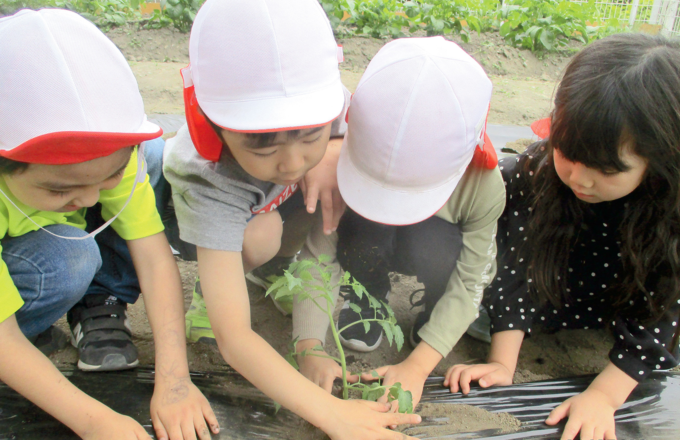 園庭の端にある畑で、野菜づくりをします。ジャガイモ、キュウリ、ミニトマト等、皆で育てます。野菜の成長が楽しみです。