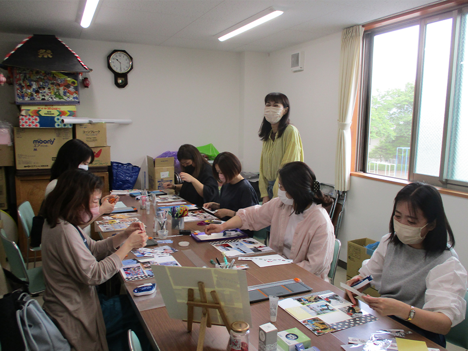 幼稚園では、お母さん方のサークル活動を行っています。外部より講師の先生をお願いしてスクラップブッキング教室を行っています。在園児のお母さんや、卒園児のお母さん、地域のみなささんも参加され楽しく活動しています。