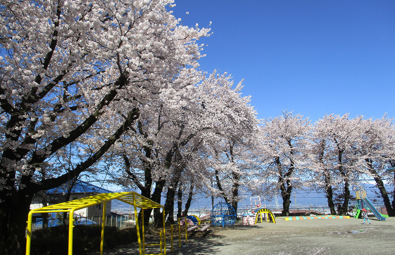 満開の桜の木々。ピンク一色、春色に包まれた幼稚園。桜の花びらや、赤くなった桜の実を集めたり、紅葉した落ち葉で遊んだり、四季折々遊びのなかに出てくる桜の木に囲まれた幼稚園です。